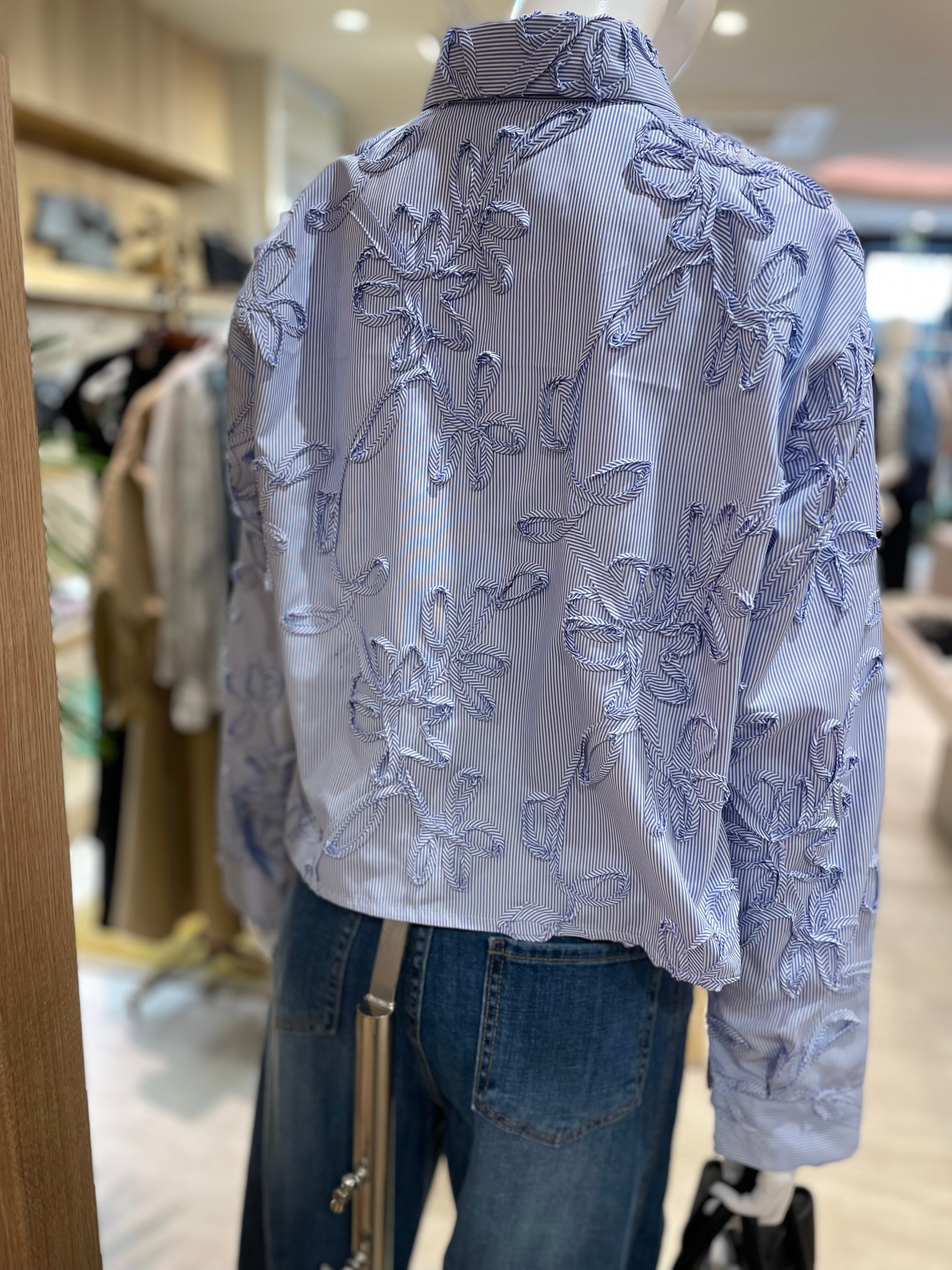 繊細なストライプ生地に、立体感のあるフラワー刺繍を贅沢にあしらったデザインブラウス。