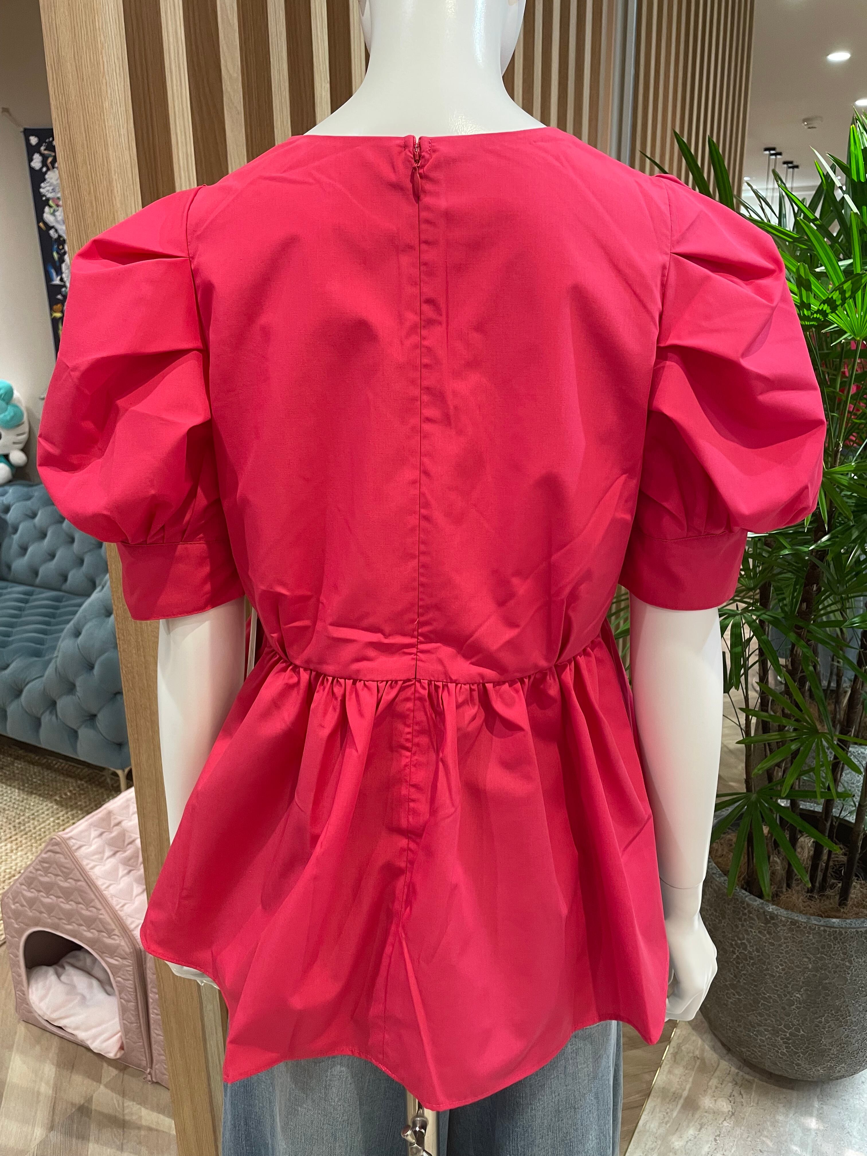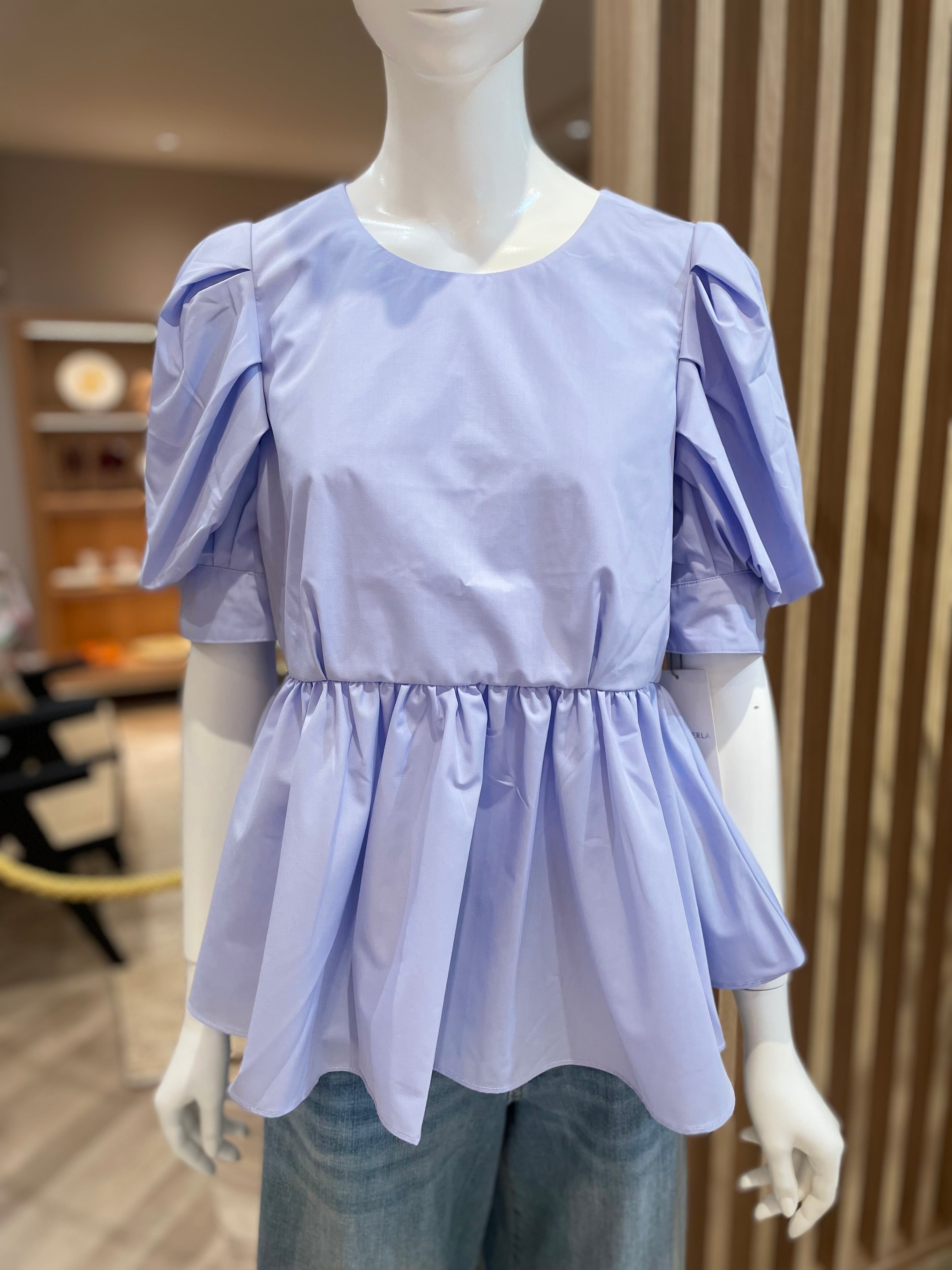 ふんわりとした立体感のあるパフスリーブと、ウエスト切替のペプラムデザインが女性らしいシルエットを演出